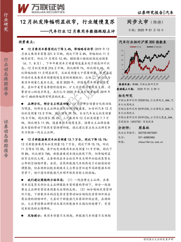 【万联证券】【20200110】汽车行业12月乘用车数据跟踪点评:12月批发降幅明显收窄,行业缓慢复苏-6页