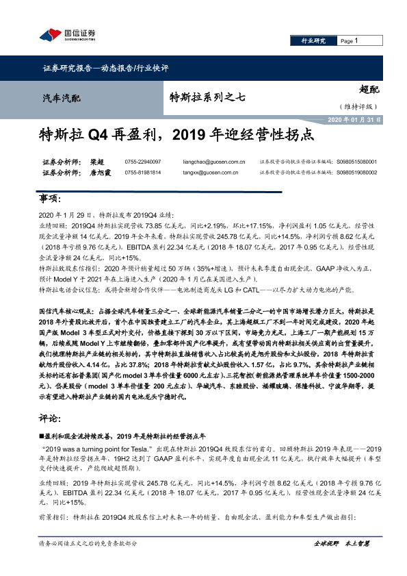 【国信证券】【20200131】特斯拉系列之七:特斯拉Q4再盈利,2019年迎经营性拐点-11页