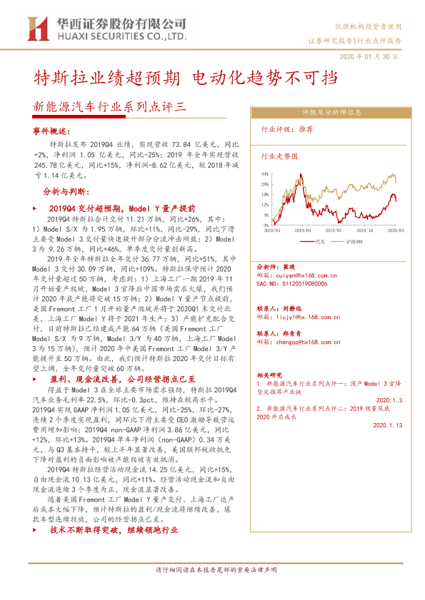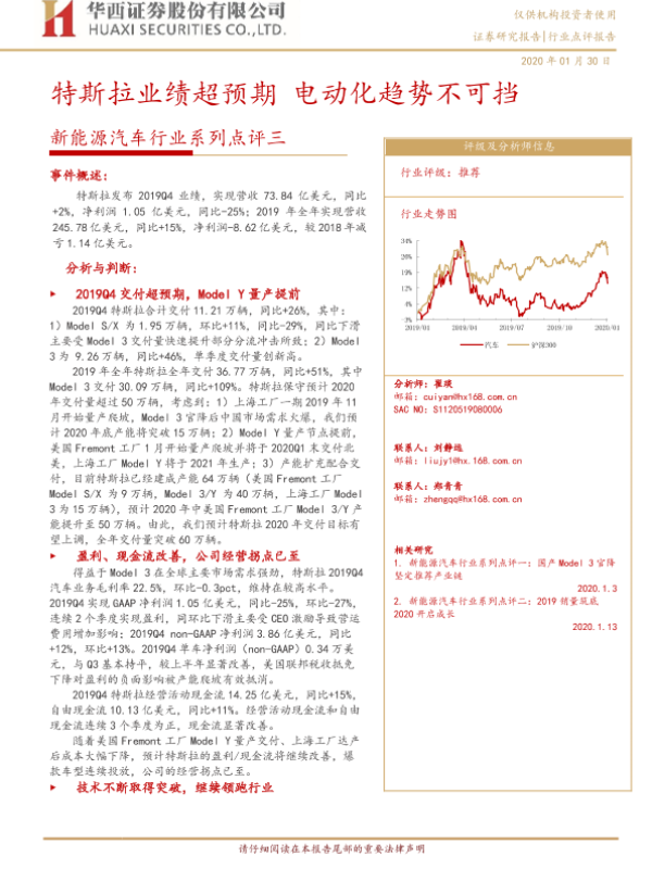 【华西证券】【20200130】新能源汽车行业系列点评三:特斯拉业绩超预期 电动化趋势不可挡-5页