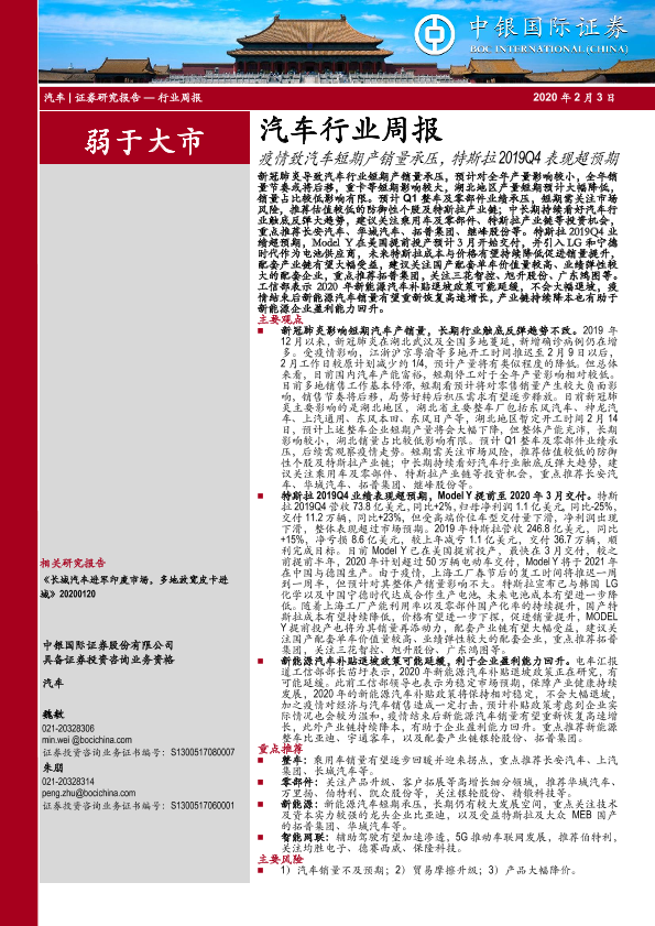 【中银证券】【20200203】20200203-中银证券-汽车行业周报:疫情致汽车短期产销量承压,特斯拉2019Q4表现超预期-16页