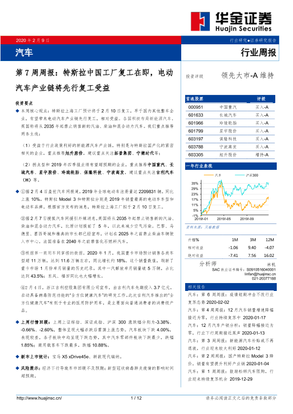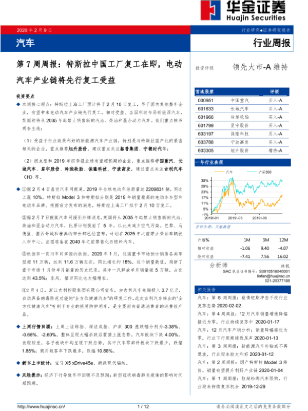 【华金证券】【20200209】汽车第7周周报:特斯拉中国工厂复工在即,电动汽车产业链将先行复工受益-12页