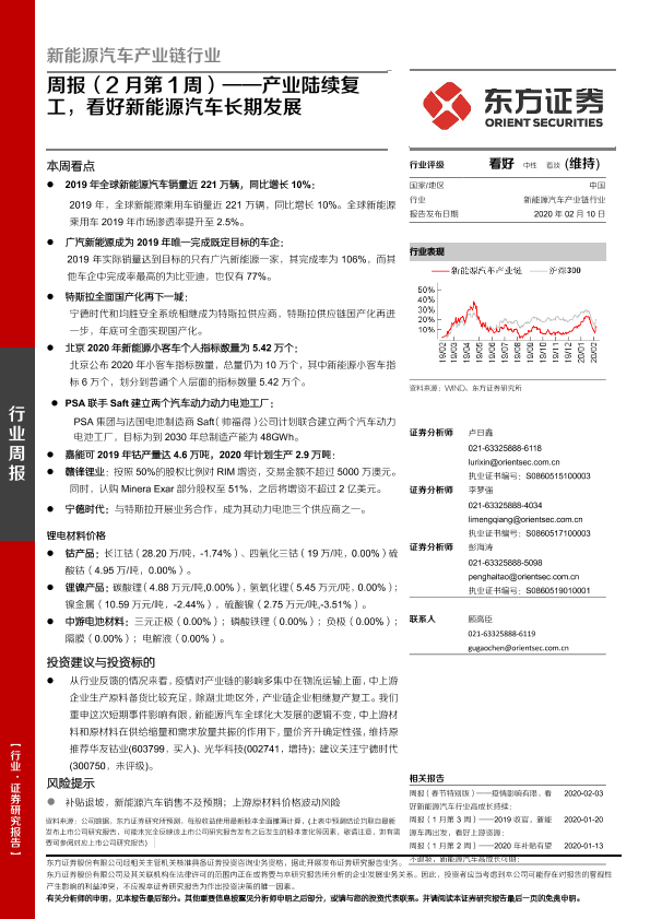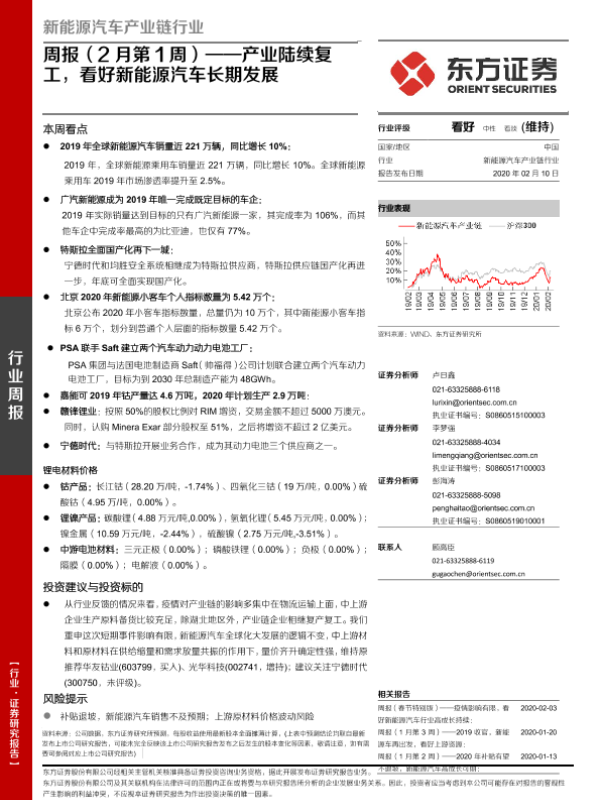 【东方证券】【20200210】新能源汽车产业链行业周报(2月第1周):产业陆续复工,看好新能源汽车长期发展-22页