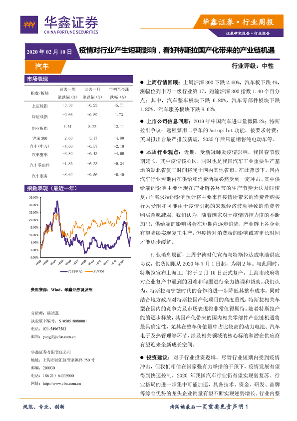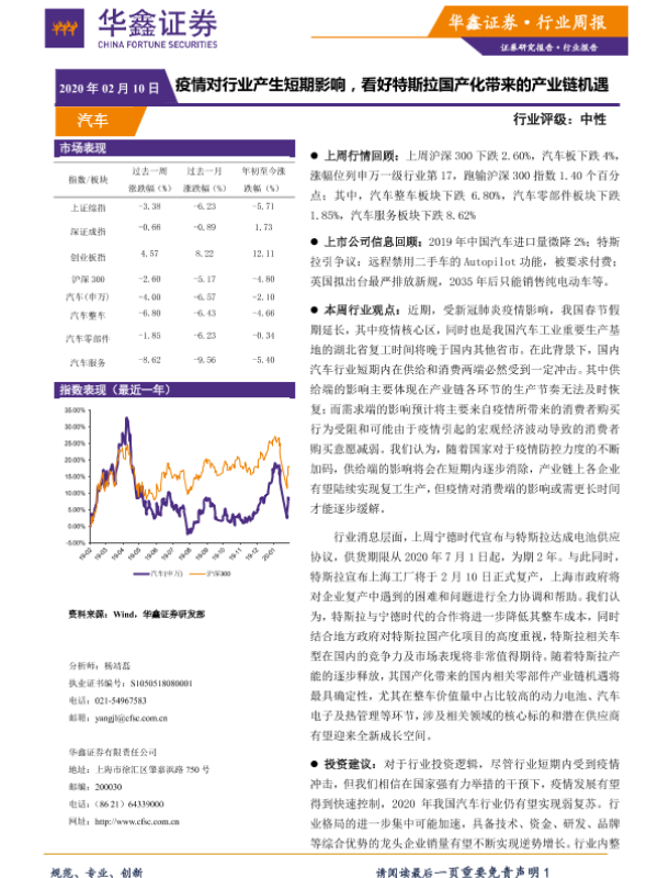 【华鑫证券】【20200210】20200210-华鑫证券-汽车行业周报:疫情对行业产生短期影响,看好特斯拉国产化带来的产业链机遇-20页