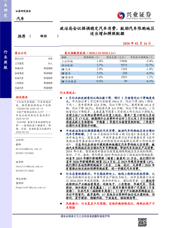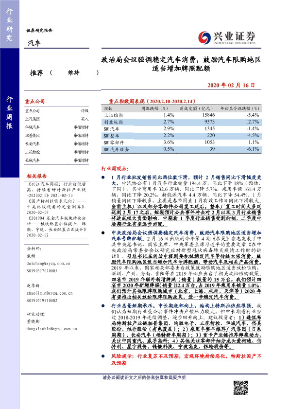 【兴业证券】【20200216】20200216-兴业证券-汽车行业周报:政治局会议强调稳定汽车消费,鼓励汽车限购地区适当增加牌照配额-20页