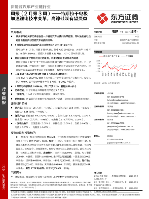 【东方证券】【20200224】20200224-东方证券-新能源汽车行业产业链行业周报(2月第3周):特斯拉干电极加速锂电技术变革,高镍硅炭有望受益-23页