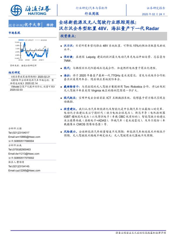 【海通证券】【20200224】20200224-海通证券-汽车与零配件行业周报:全球新能源及无人驾驶行业跟踪周报:沃尔沃全车型配置48V,海拉量产下一代Radar-6页