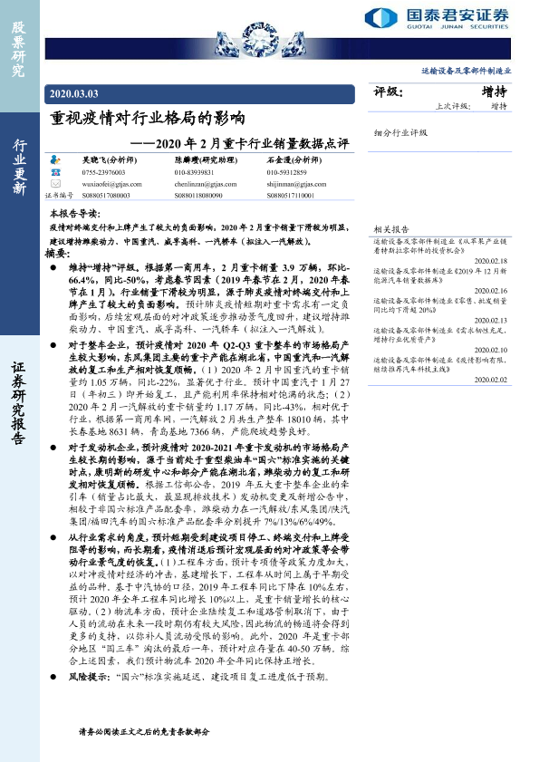 【国泰君安证券】【20200303】2020年2月重卡行业销量数据点评:重视疫情对行业格局的影响-3页