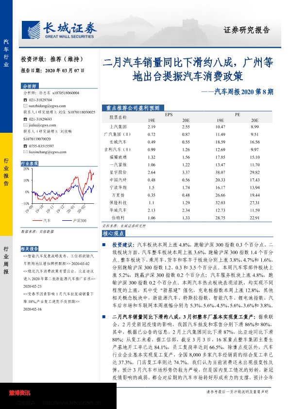 【长城证券】【20200307】汽车周报2020第8期:二月汽车销量同比下滑约八成,广州等地出台提振汽车消费政策-14页