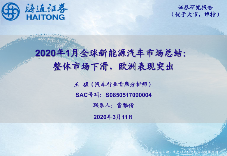 【海通证券】【20200311】2020年1月全球新能源汽车市场总结:整体市场下滑,欧洲表现突出-11页