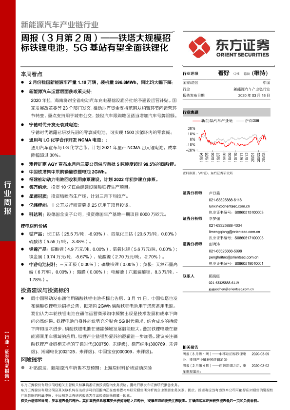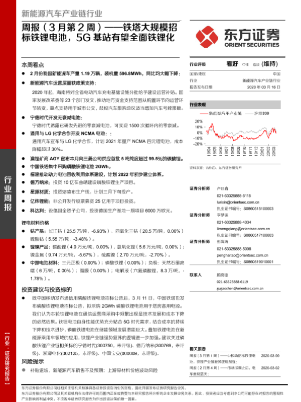 【东方证券】【20200316】新能源汽车产业链行业周报(3月第2周):铁塔大规模招标铁锂电池,5G基站有望全面铁锂化-23页