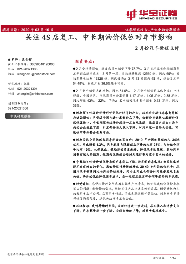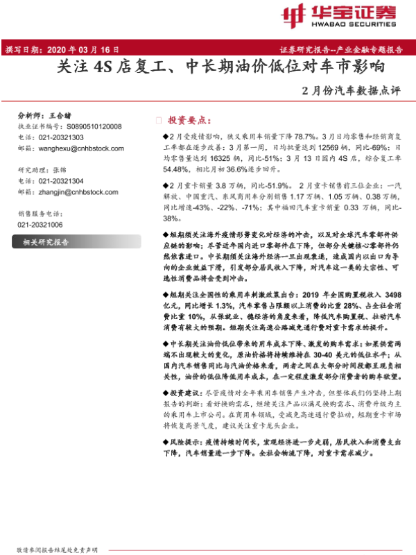 【华宝证券】【20200316】2月份汽车数据点评:关注4S店复工、中长期油价低位对车市影响-14页