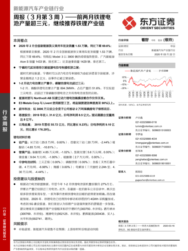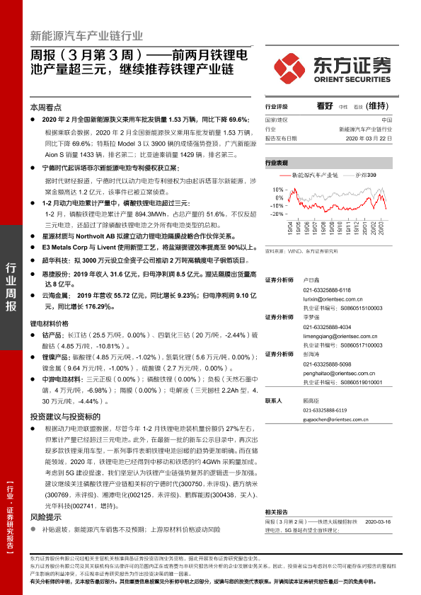 【东方证券】【20200322】新能源汽车产业链行业周报(3月第3周)-前两月铁锂电池产量超三元,继续推荐铁锂产业链-23页