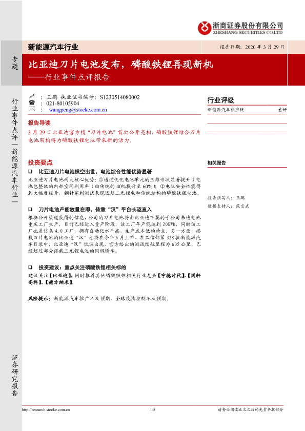 【浙商证券】【20200329】20200329-浙商证券-新能源汽车行业事件点评报告:比亚迪刀片电池发布,磷酸铁锂再现新机-5页