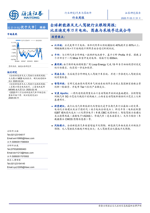 【海通证券】【20200331】全球新能源及无人驾驶行业跟踪周报:比亚迪发布刀片电池,图森与采埃孚达成合作-5页