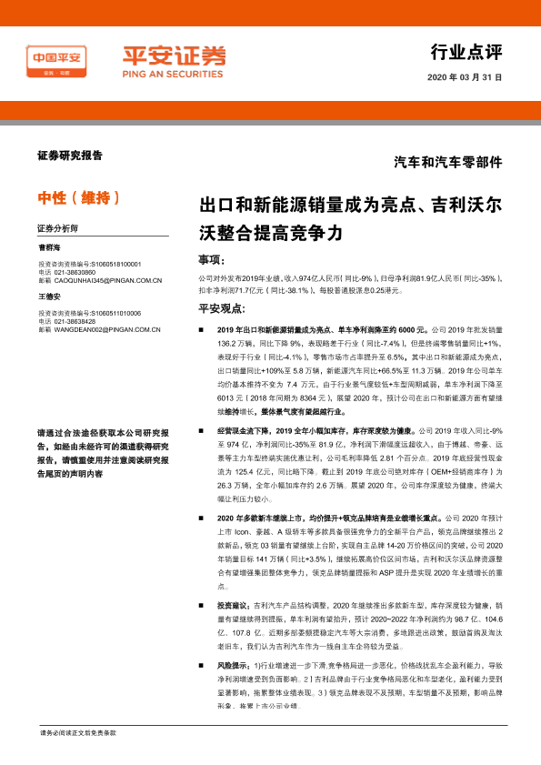 【平安证券】【20200331】汽车和汽车零部件行业点评:出口和新能源销量成为亮点、吉利沃尔沃整合提高竞争力-4页