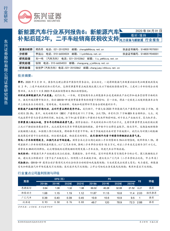 【东兴证券】【20200401】新能源汽车行业系列报告8:新能源汽车补贴后延2年,二手车经销商获税收支持-12页