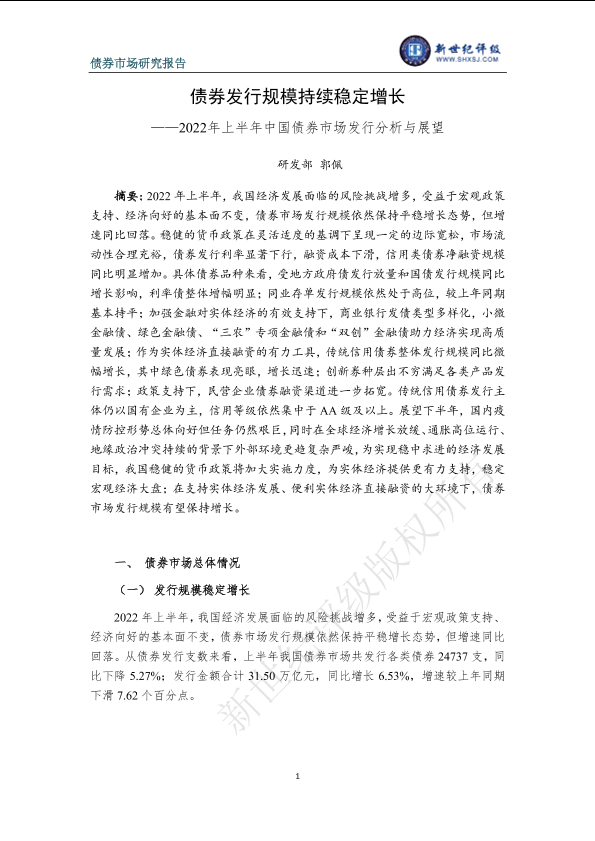 【新世纪评级】【20220630】债券发行规模持续稳定增长——2022年上半年中国债券市场发行分析与展望-20页
