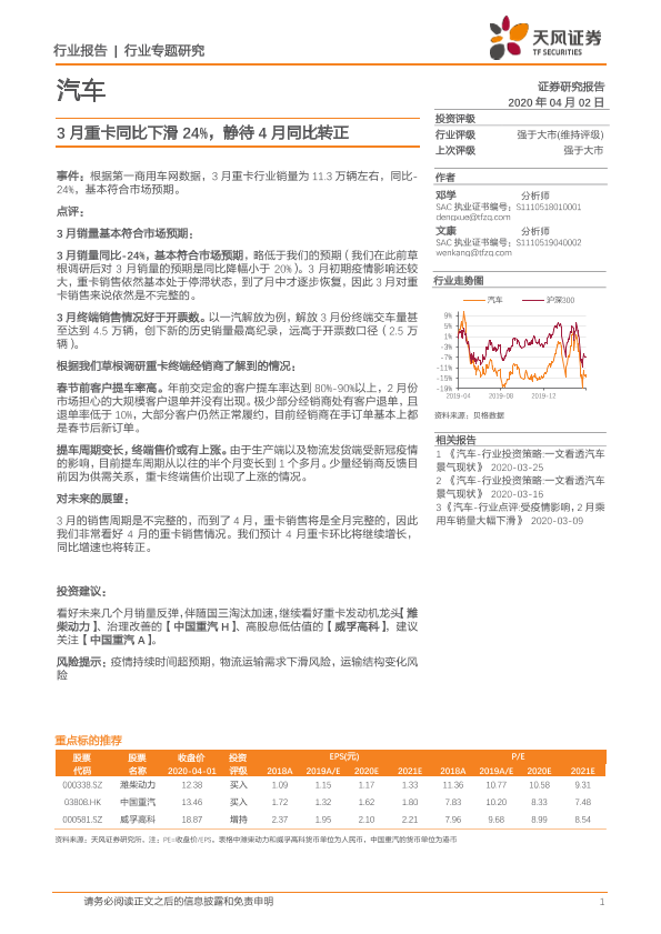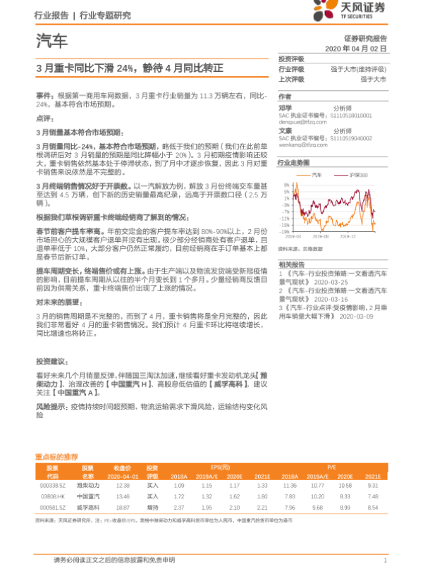 【天风证券】【20200402】汽车行业专题研究:3月重卡同比下滑24%,静待4月同比转正-11页