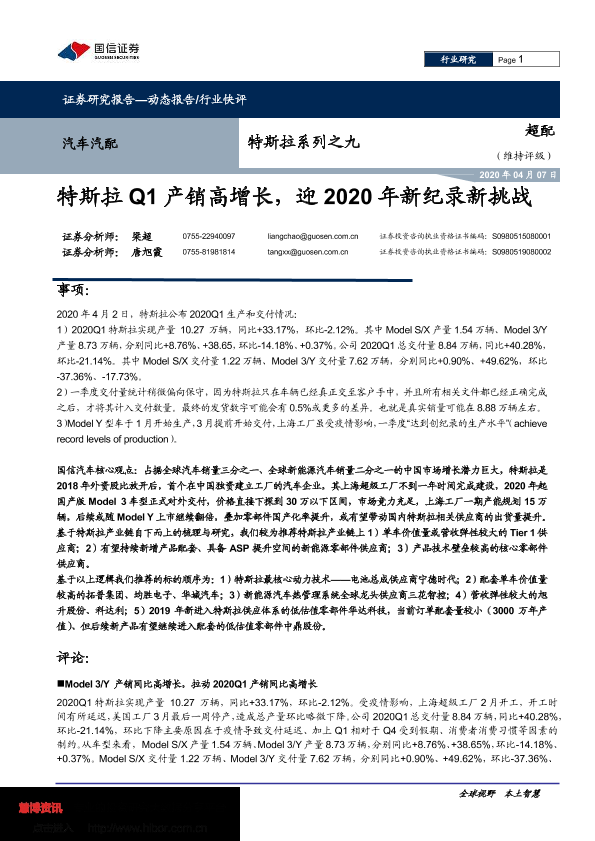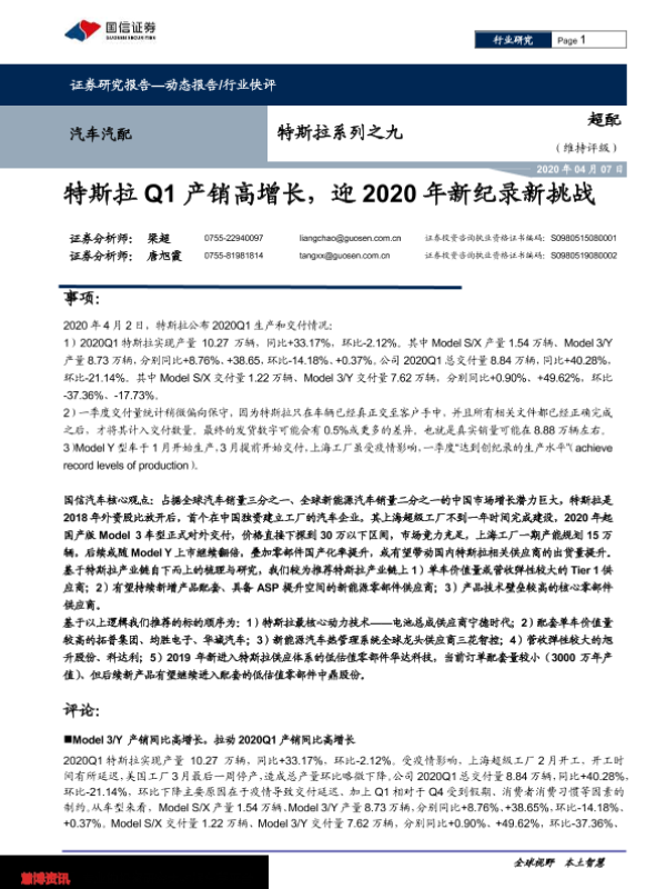 【国信证券】【20200407】特斯拉系列之九:特斯拉Q1产销高增长,迎2020年新纪录新挑战-9页