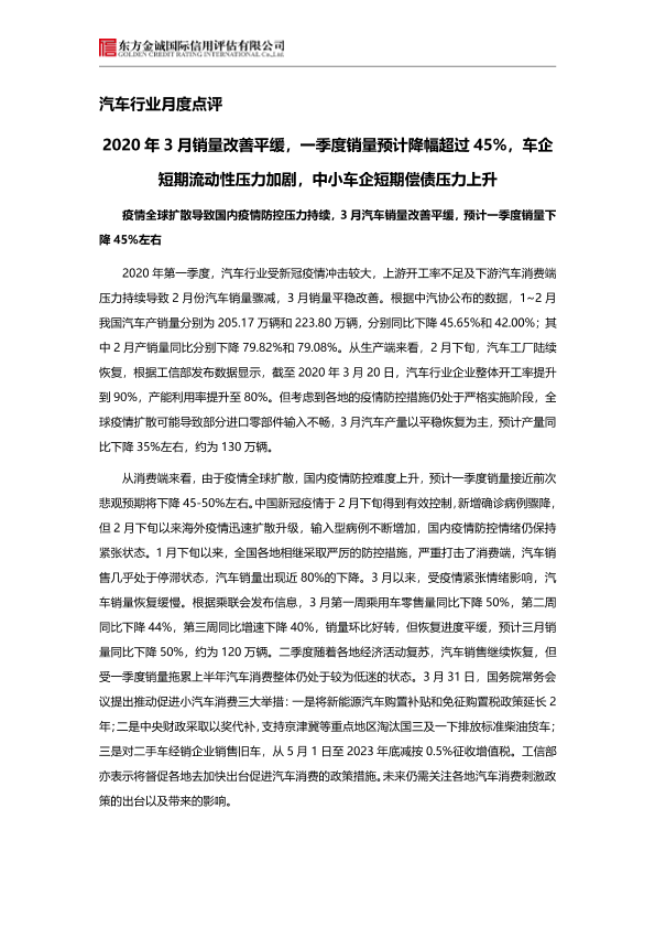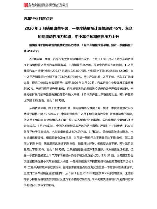 【东方金诚】【20200407】2020年3月销量改善平缓,一季度销量预计降幅超过45%,车企短期流动性压力加剧,中小车企短期偿债压力上升-5页