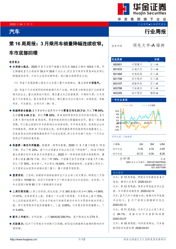 【华金证券】【20200411】汽车第16周周报:3月乘用车销量降幅连续收窄,车市底部回暖-13页