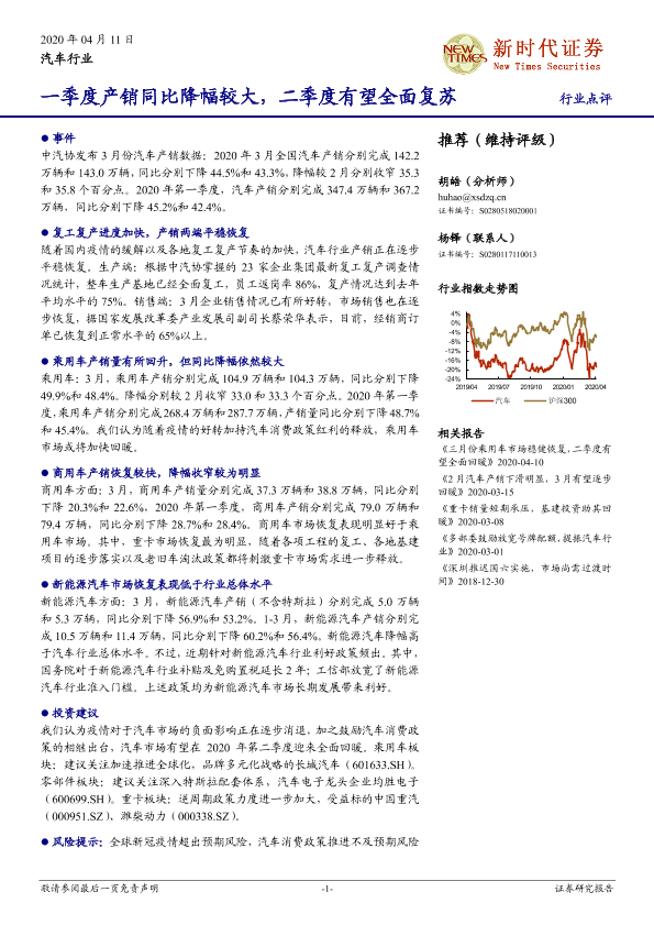 【新时代证券】【20200411】汽车行业:一季度产销同比降幅较大,二季度有望全面复苏-7页