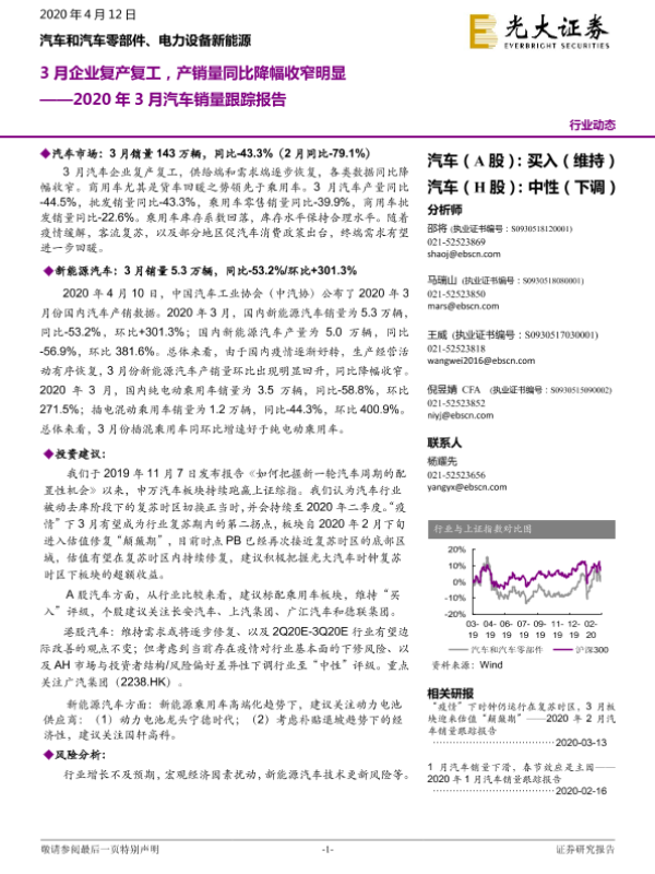 【光大证券】【20200412】2020年3月汽车销量跟踪报告:3月企业复产复工,产销量同比降幅收窄明显-13页