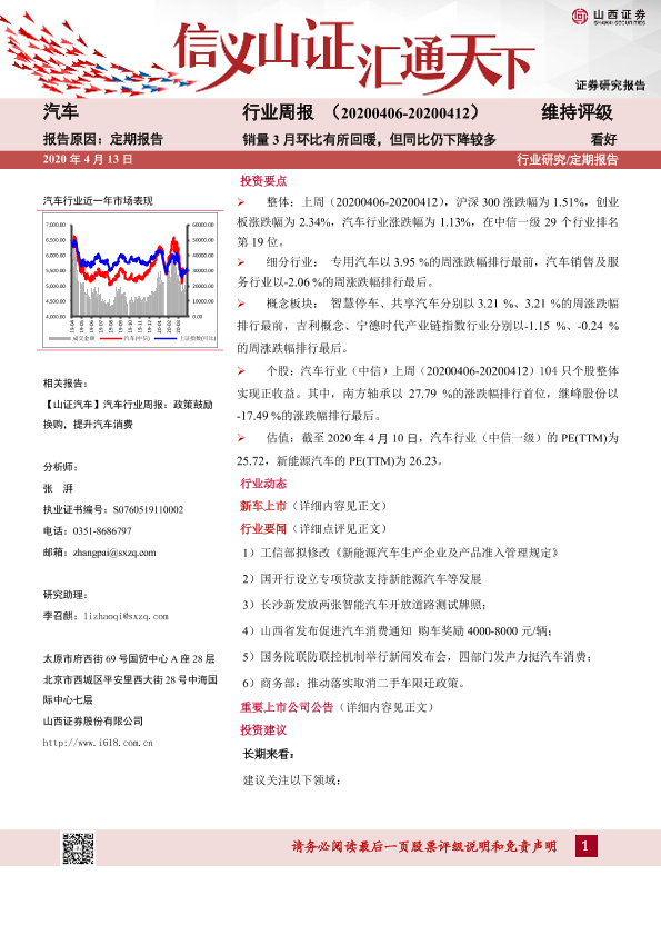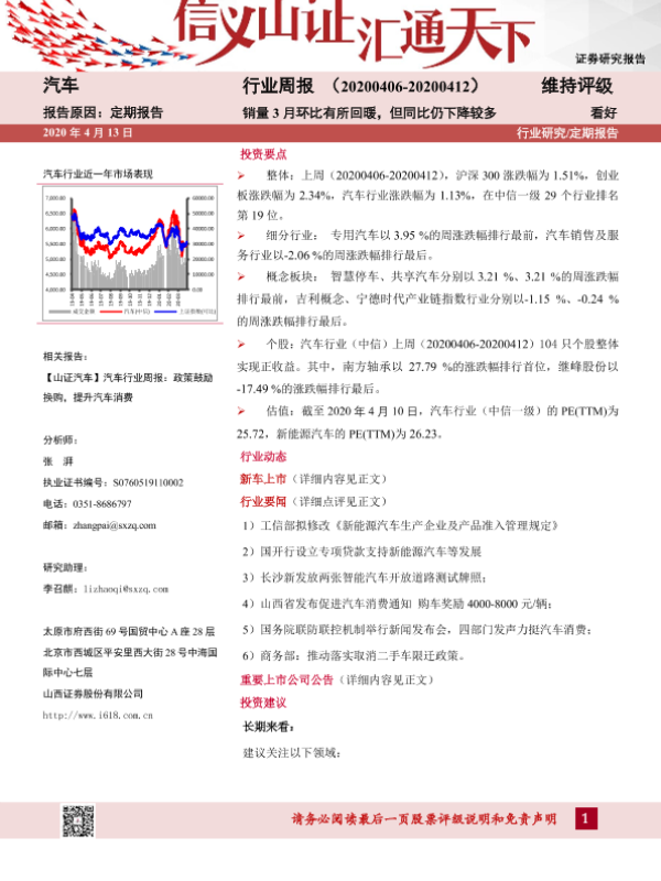 【山西证券】【20200413】20200413-山西证券-汽车行业周报:销量3月环比有所回暖,但同比仍下降较多-15页