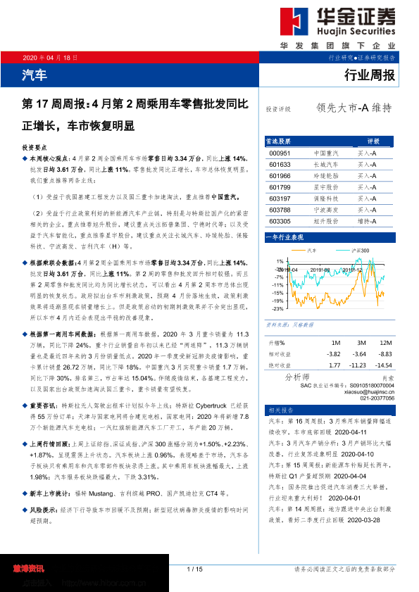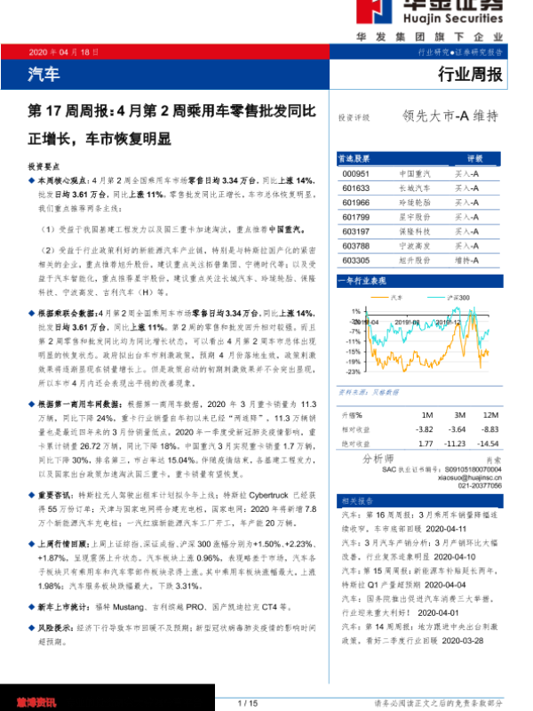 【华金证券】【20200418】20200418-华金证券-汽车行业第17周周报:4月第2周乘用车零售批发同比正增长,车市恢复明显-15页