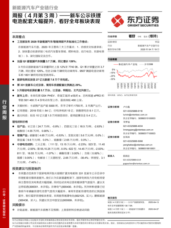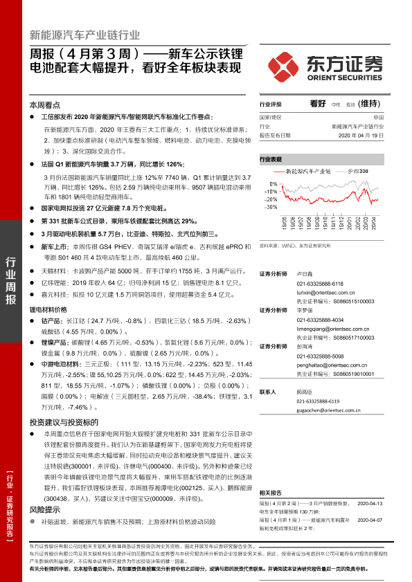 【东方证券】【20200419】新能源汽车产业链行业周报(4月第3周):新车公示铁锂电池配套大幅提升,看好全年板块表现-25页
