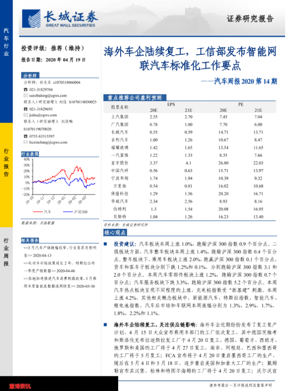 【长城证券】【20200419】汽车周报2020第14期:海外车企陆续复工,工信部发布智能网联汽车标准化工作要点-13页