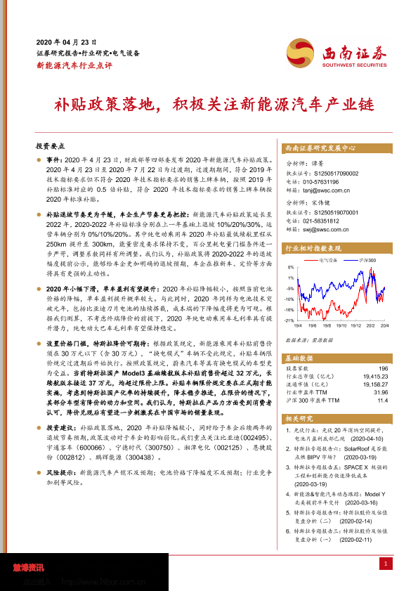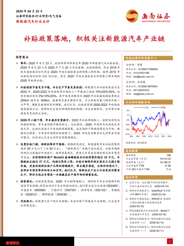 【西南证券】【20200423】新能源汽车行业点评:补贴政策落地,积极关注新能源汽车产业链-6页