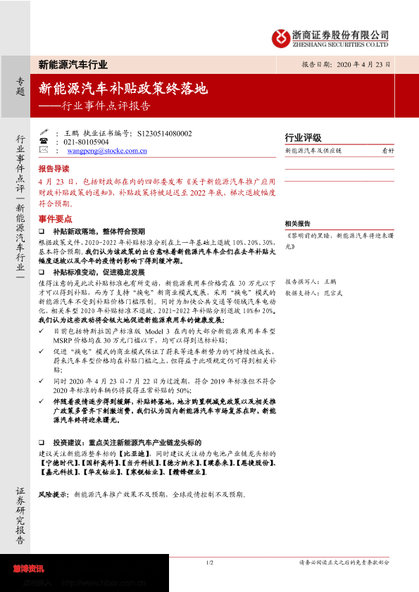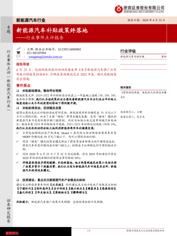 【浙商证券】【20200423】新能源汽车行业事件点评报告:新能源汽车补贴政策终落地-2页