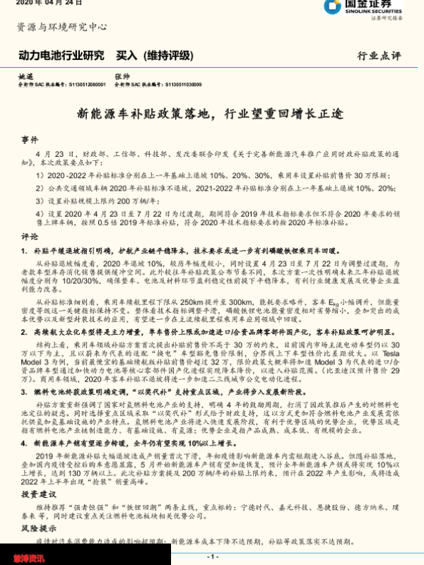 【国金证券】【20200424】动力电池行业研究:新能源车补贴政策落地,行业望重回增长正途-6页