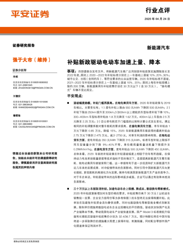 【平安证券】【20200424】新能源汽车行业点评:补贴新政驱动电动车加速上量、降本-4页