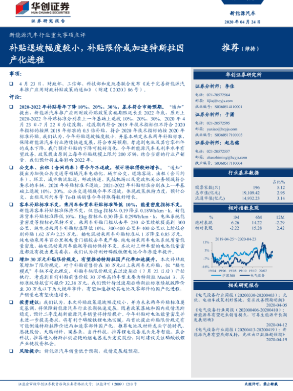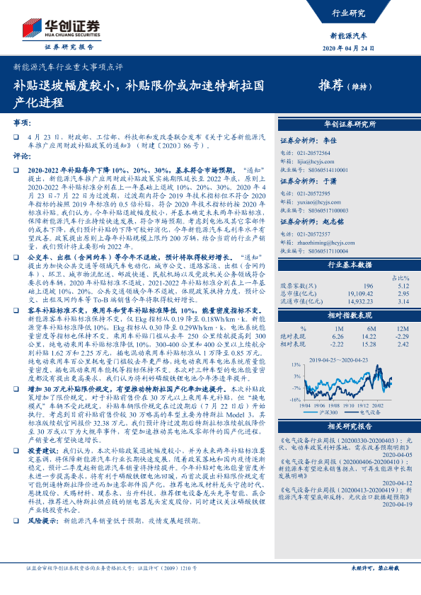 【华创证券】【20200424】新能源汽车行业重大事项点评:补贴退坡幅度较小,补贴限价或加速特斯拉国产化进程-7页