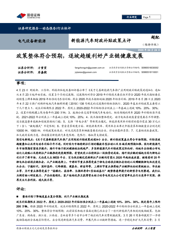 【国信证券】【20200424】新能源汽车财政补贴政策点评:政策整体符合预期,退坡趋缓利好产业链健康发展-8页