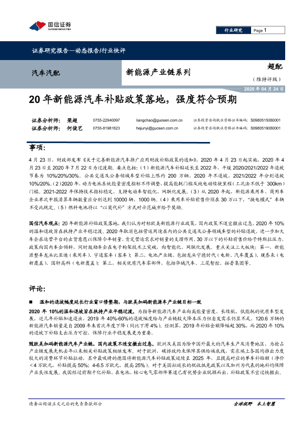 【国信证券】【20200424】20年新能源汽车补贴政策落地,强度符合预期-7页
