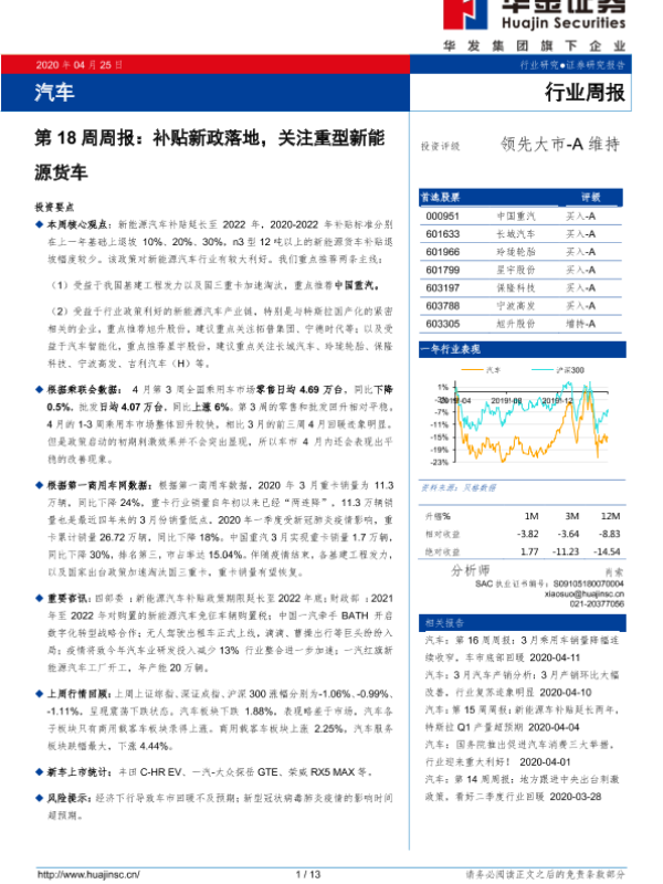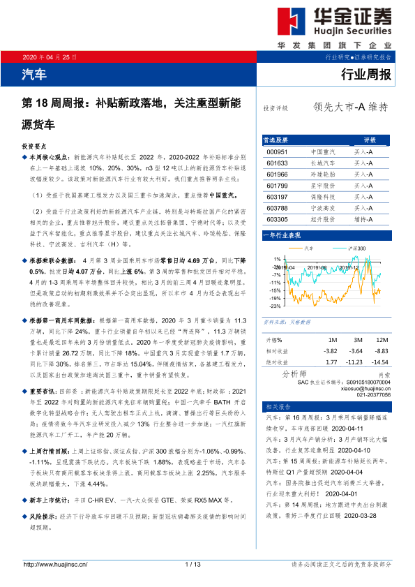 【华金证券】【20200425】汽车第18周周报:补贴新政落地,关注重型新能源货车-13页