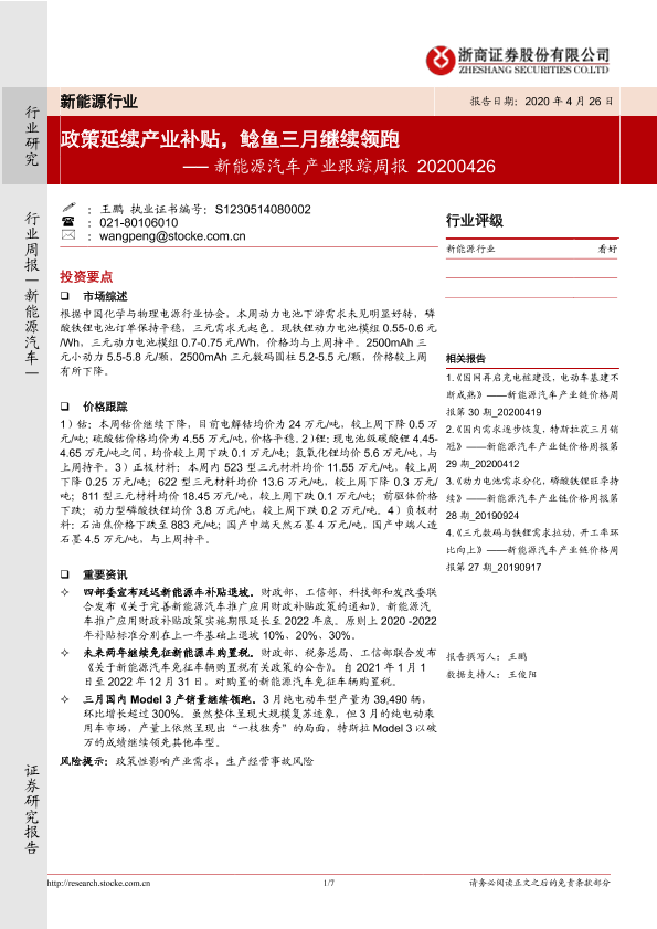 【浙商证券】【20200426】20200426-浙商证券-新能源汽车产业跟踪周报:政策延续产业补贴,鲶鱼三月继续领跑-7页