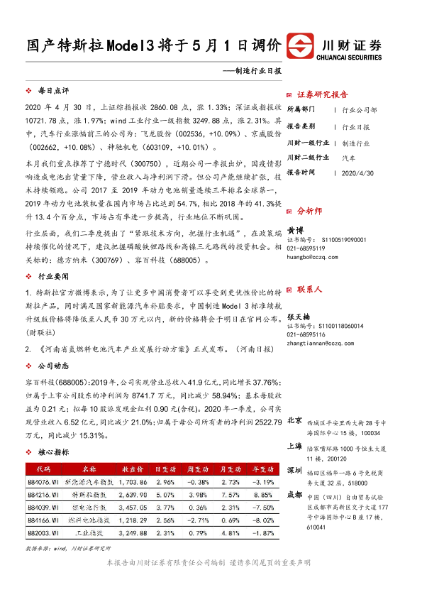 【川财证券】【20200430】制造行业日报:国产特斯拉Model3将于5月1日调价-3页
