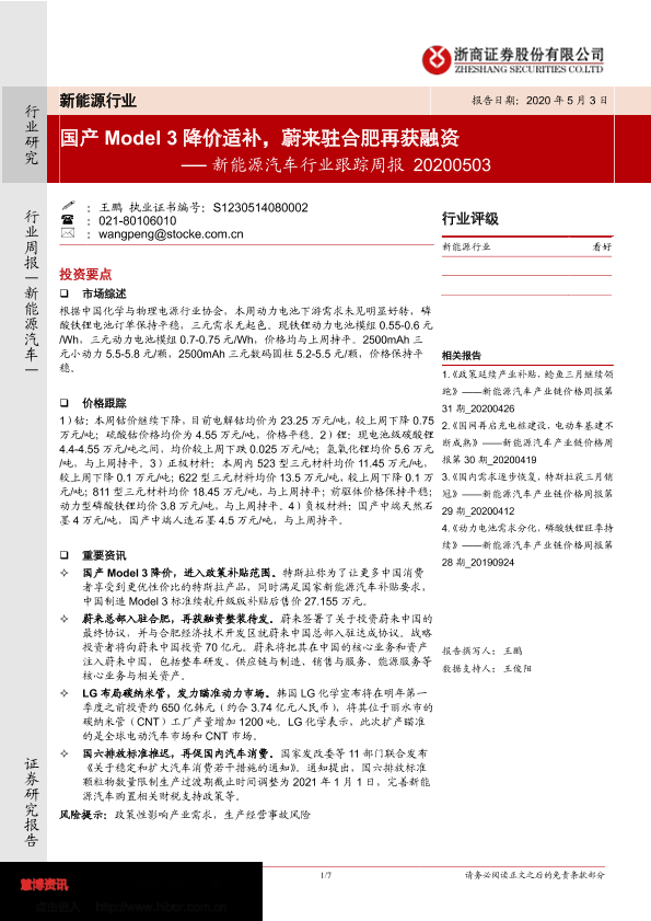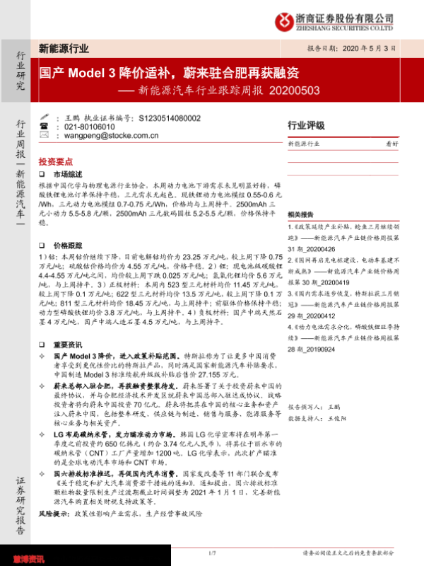 【浙商证券】【20200503】20200503-浙商证券-新能源汽车行业跟踪周报:国产Model3降价适补,蔚来驻合肥再获融资-7页