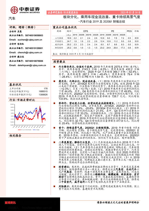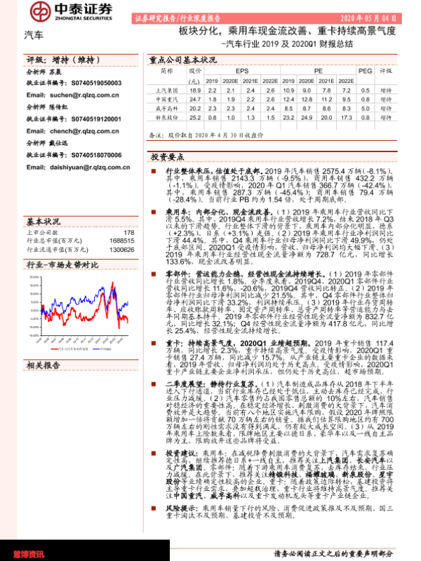 【中泰证券】【20200504】汽车行业2019及2020Q1财报总结:板块分化,乘用车现金流改善、重卡持续高景气度-28页