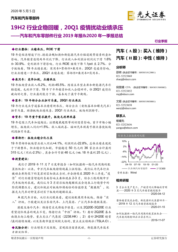 【光大证券】【20200505】汽车和汽车零部件行业2019年报&2020年一季报总结:19H2行业企稳回暖,20Q1疫情扰动业绩承压-30页
