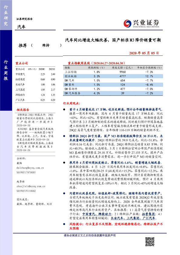 【兴业证券】【20200505】20200505-兴业证券-汽车行业周报:汽车同比增速大幅改善,国产标准M3降价销量可期-24页