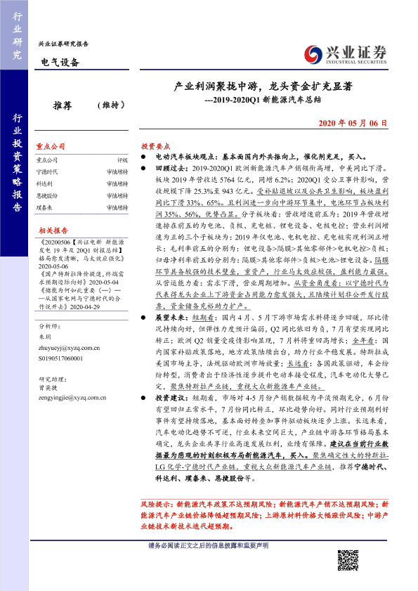 【兴业证券】【20200506】2019-2020Q1新能源汽车总结:产业利润聚拢中游,龙头资金扩充显著-30页