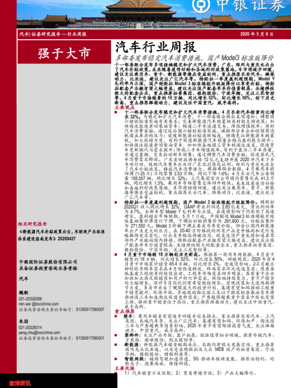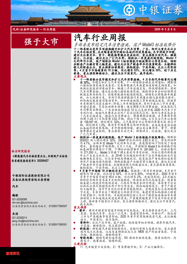 【中银证券】【20200506】中银证券-汽车行业周报:多部委发布稳定汽车消费措施,国产Model3标准版降价-19页