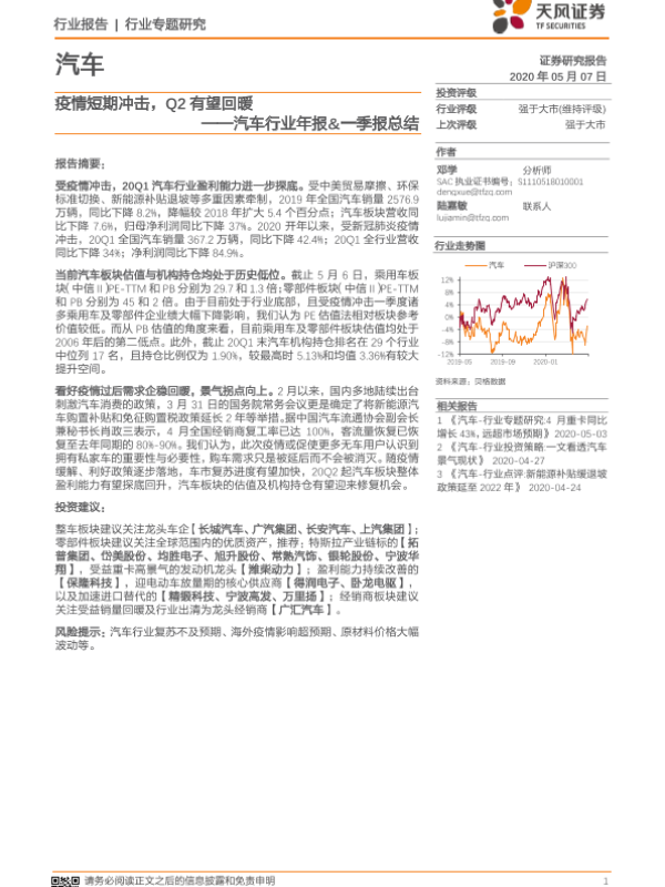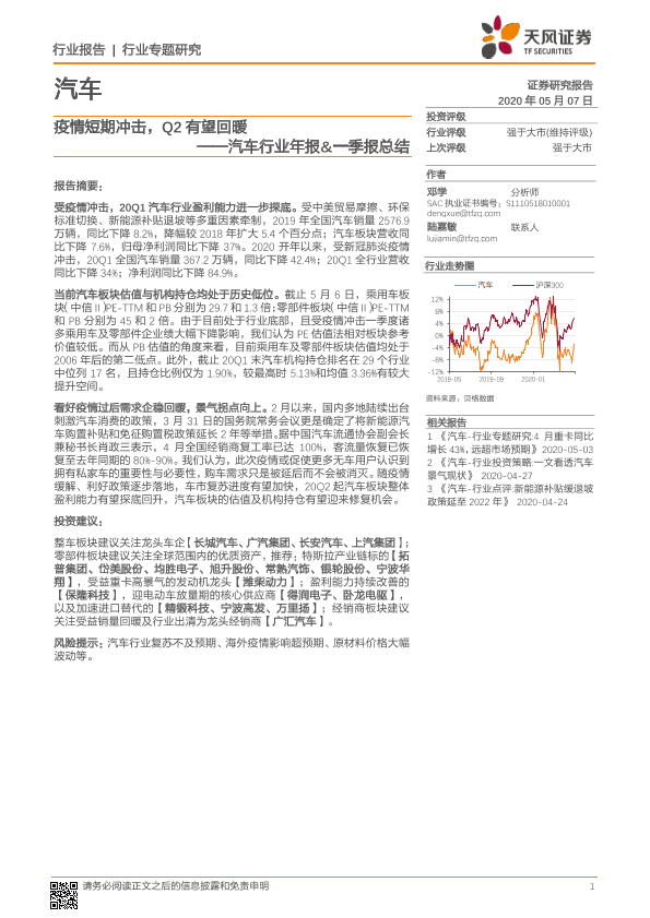 【天风证券】【20200507】疫情短期冲击,Q2有望回暖——汽车行业年报&一季报总结-11页