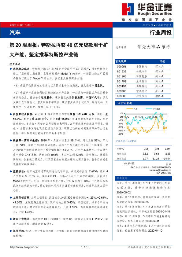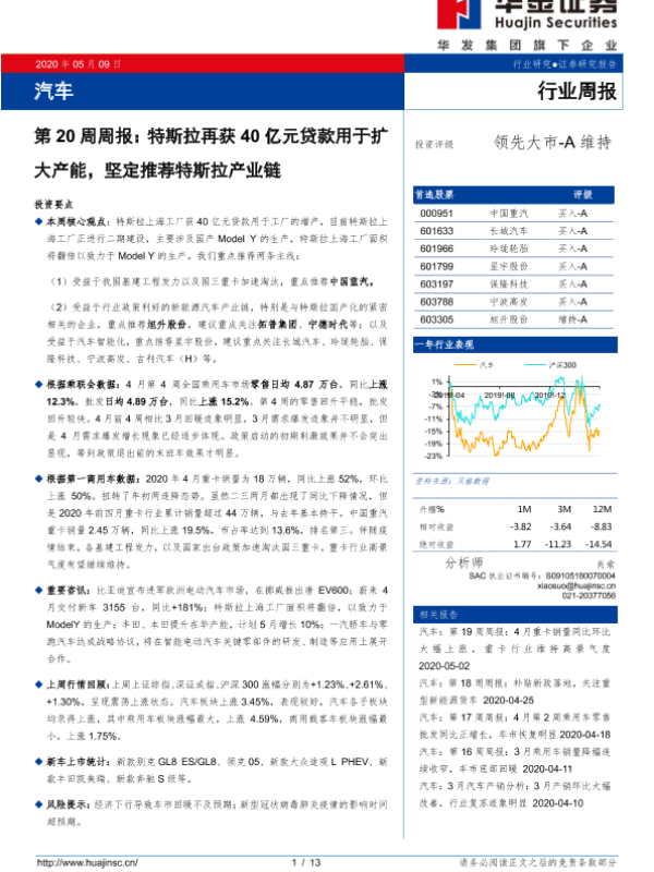 【华金证券】【20200509】汽车第20周周报:特斯拉再获40亿元贷款用于扩大产能,坚定推荐特斯拉产业链-13页