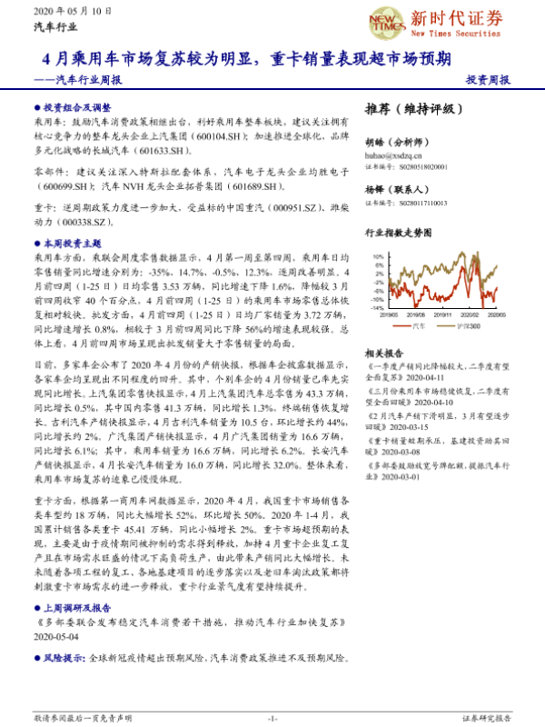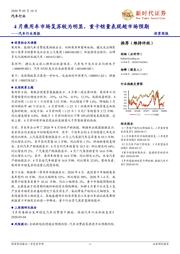 【新时代证券】【20200510】20200510-新时代证券-汽车行业周报:4月乘用车市场复苏较为明显,重卡销量表现超市场预期-18页